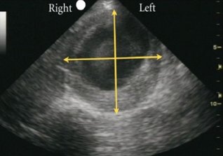 - Měření vždy zevní-zevní kontura cévy včetně trombu kolmo na dlouhou osu aneuryzmatu. Příklad na obrázku